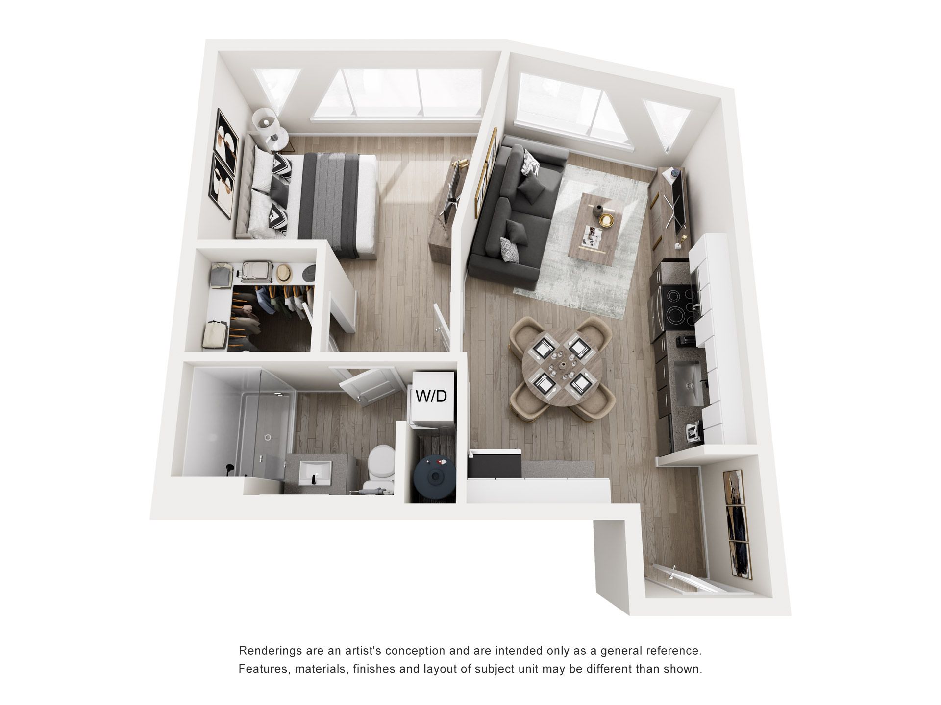 Perfectly scaled for modern city living, our one-bedroom residences offer a refined retreat in the heart of the Roosevelt Road district. These brand-new apartment homes feature open-concept layouts designed to maximize space, light, and functionality. Luxury vinyl plank flooring flows throughout, while high-end kitchens showcase quartz countertops, custom cabinetry, and stainless steel appliances. Expansive windows bring in abundant natural light, creating a bright and energizing atmosphere. Each home includes an in-unit washer and dryer for added convenience.