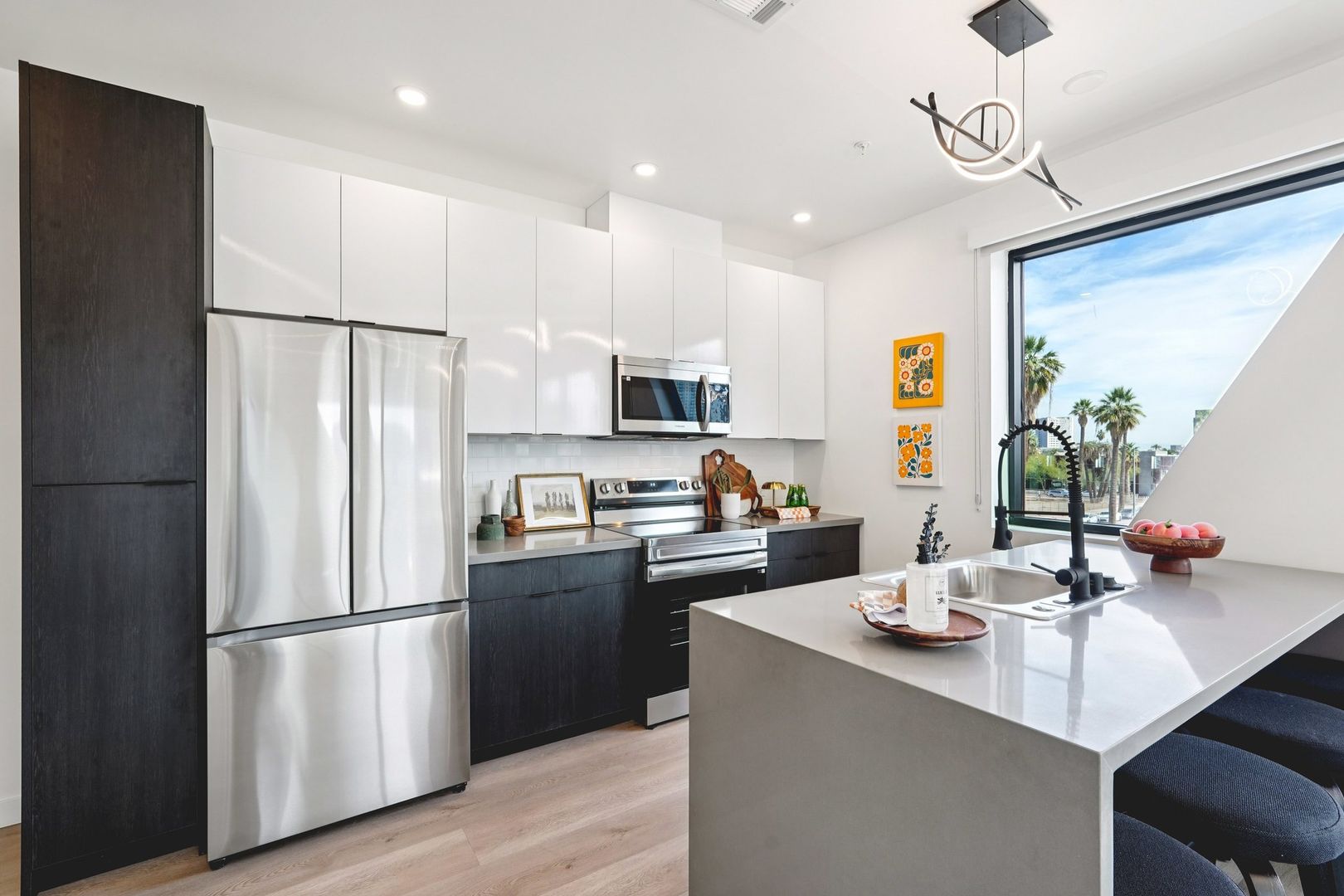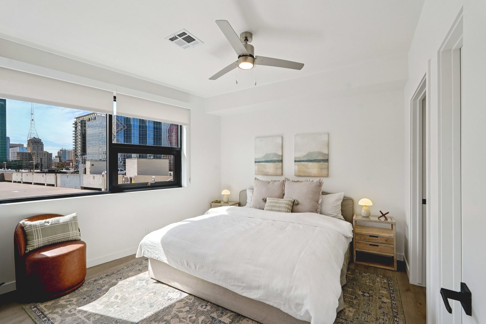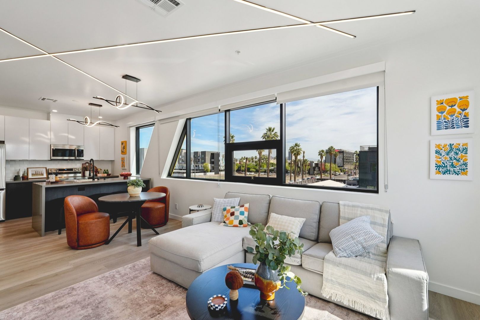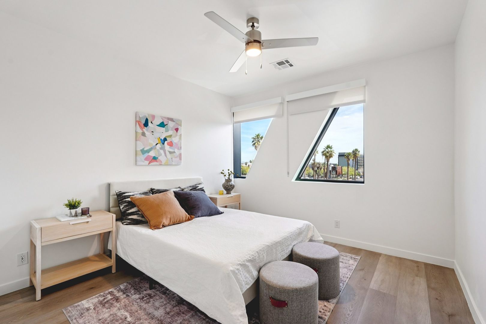 Designed for elevated comfort and privacy, the two-bedroom, two-bathroom residences offer generous living space with a refined, modern aesthetic. These brand-new homes feature well-separated bedrooms, open living areas, and high-end finishes throughout. Luxury vinyl plank flooring, quartz countertops, custom cabinetry, and stainless steel appliances create a polished yet inviting environment. With an in-unit washer and dryer and select homes offering impressive views, this layout delivers both style and functionality in one of Phoenix’s most walkable neighborhoods.