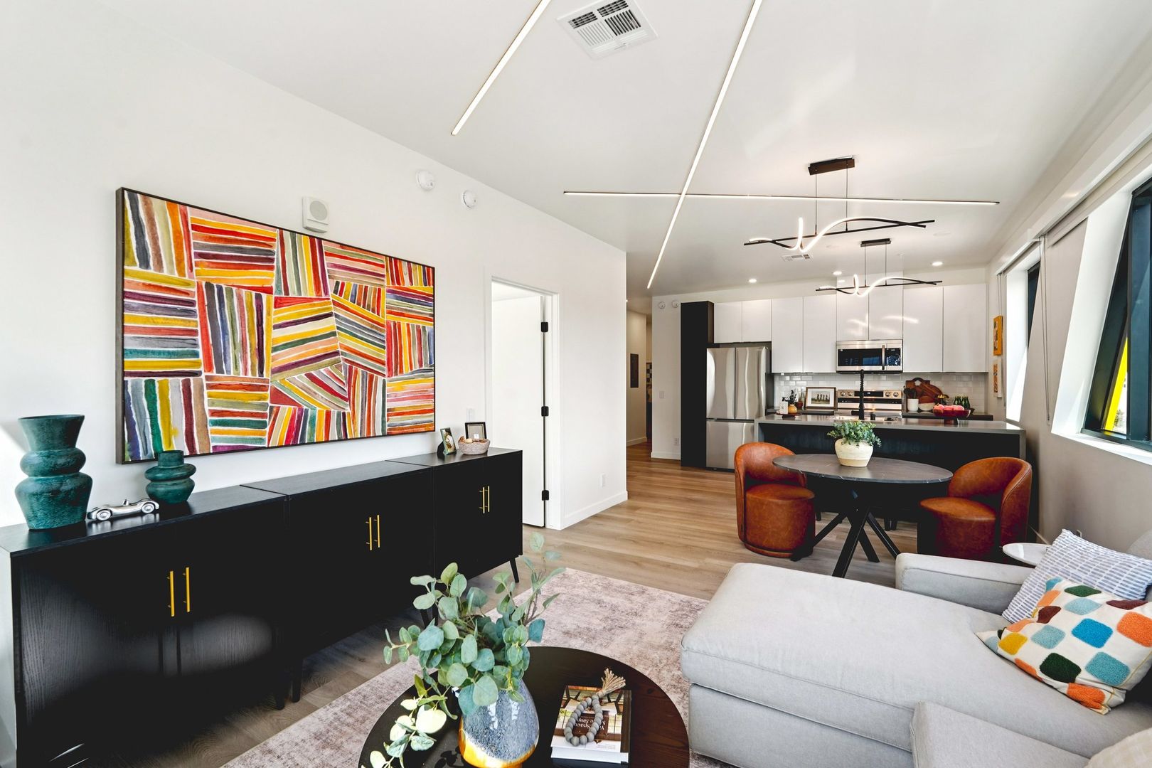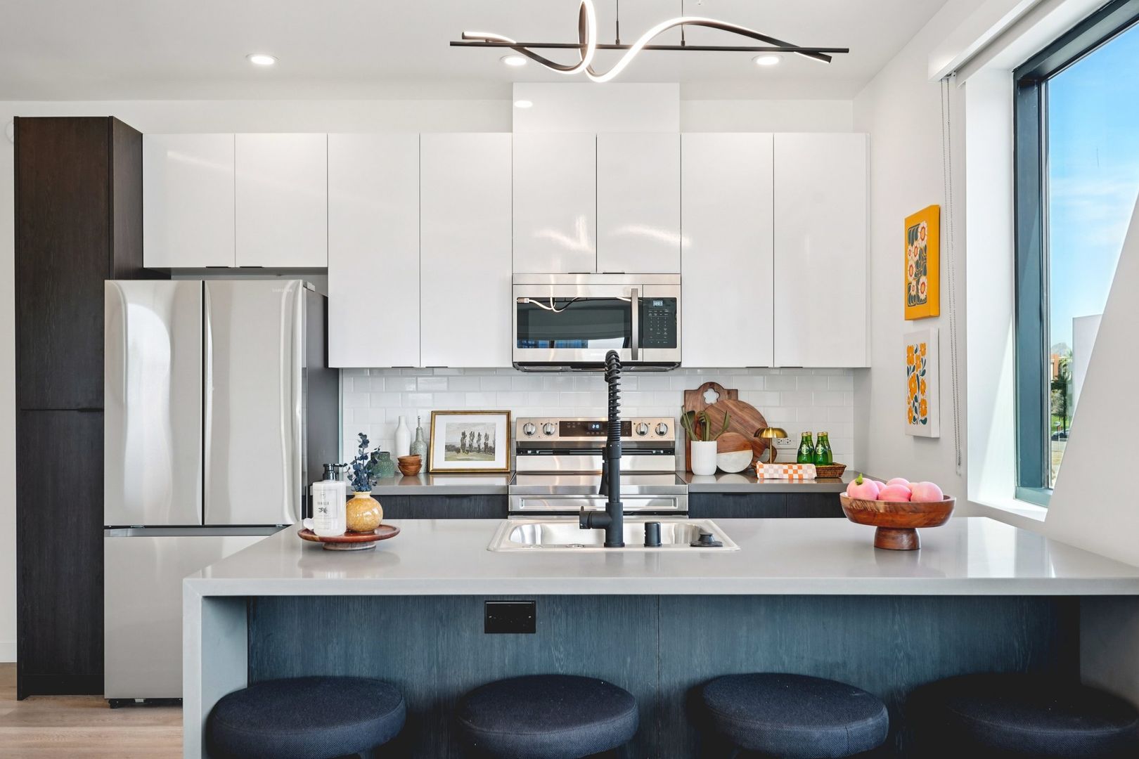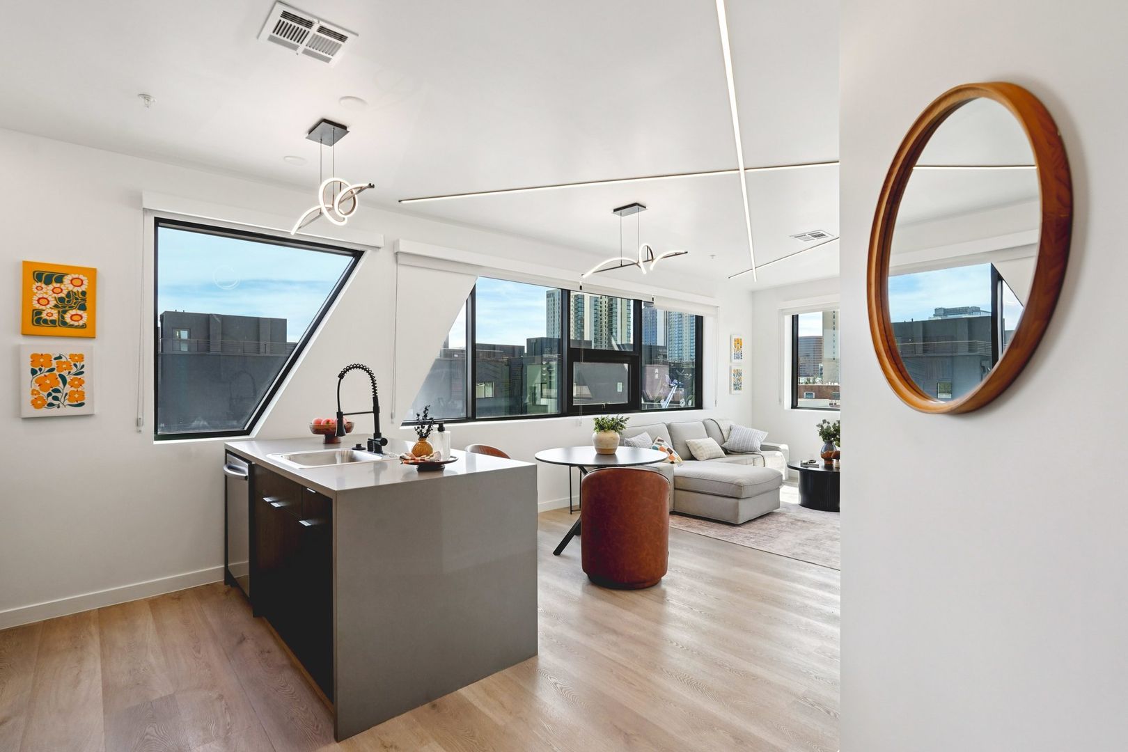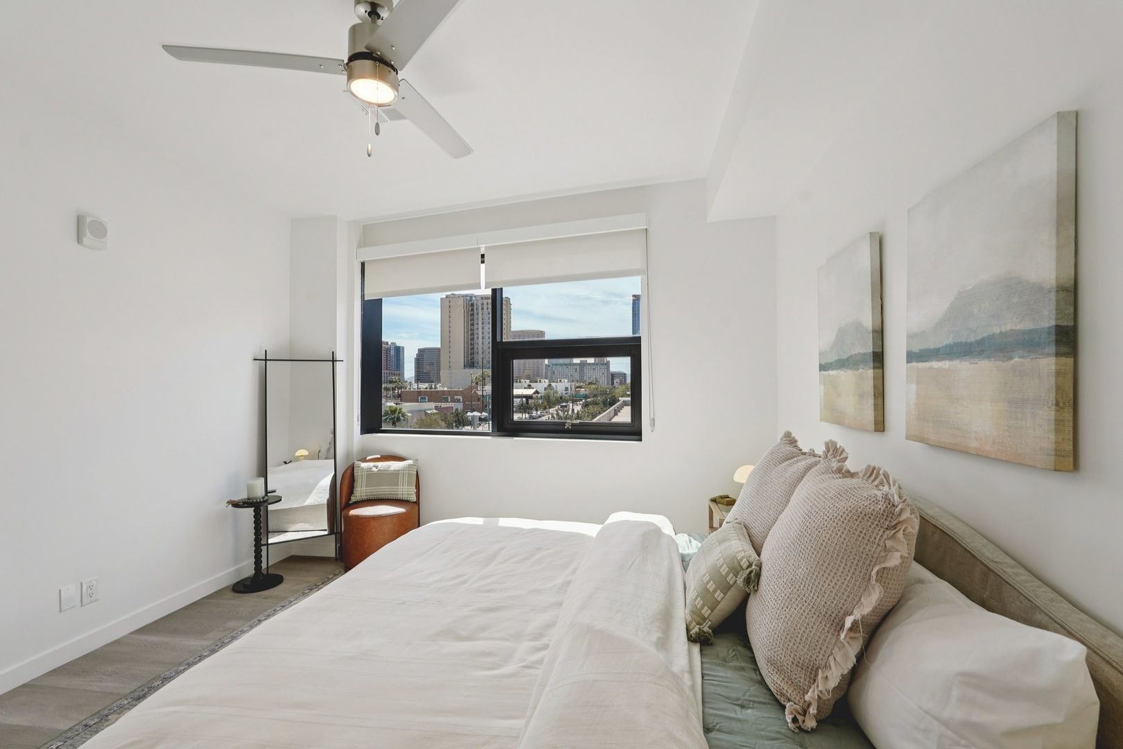 Designed for elevated comfort and privacy, the two-bedroom, two-bathroom residences offer generous living space with a refined, modern aesthetic. These brand-new homes feature well-separated bedrooms, open living areas, and high-end finishes throughout. Luxury vinyl plank flooring, quartz countertops, custom cabinetry, and stainless steel appliances create a polished yet inviting environment. With an in-unit washer and dryer and select homes offering impressive views, this layout delivers both style and functionality in one of Phoenix’s most walkable neighborhoods.